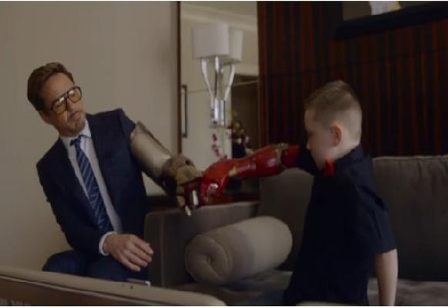 El Universal/El Bravo 13/03/15.- El actor Robert Downey Jr, en su papel del superhéroe "Iron Man", dio a un pequeño con discapacidad un brazo biónico. Como parte de The Collective Project el actor