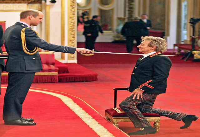11/10/16.-El rockero Rod Stewart lució unos pantalones de estampado escocés y una chaqueta con adornos escarlata de estilo militar al ser nombrado hoy Sir por el Príncipe Guillermo, en el Palacio d