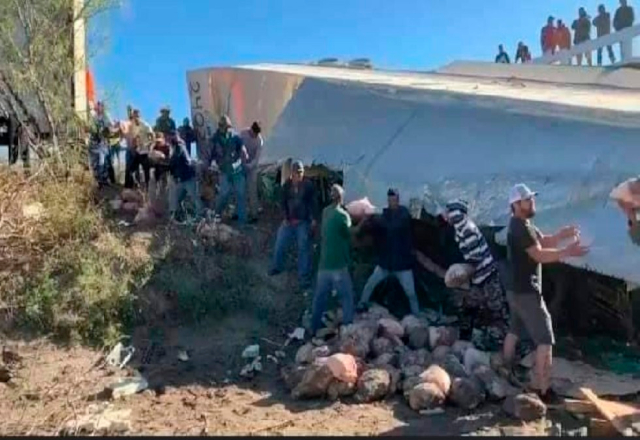 Contrario a lo que ha sucedido en otras ocasiones y lugares en el país, pobladores apoyaron para impedir la rapiña luego de la volcadura de un trailer que transportaba piernas de cerdo en el kilóme