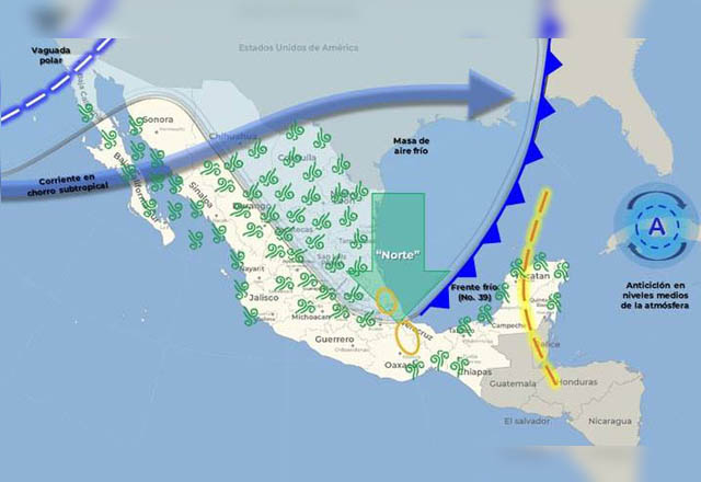 Para este viernes, el frente frío 39 recorrerá el norte y noreste de la República Mexicana, interaccionará con una vaguada polar y con la entrada de humedad generada por las corrientes en chorro p