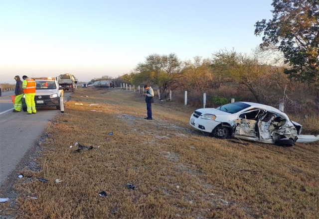 En el kilómetro 42 de la Carretera Federal 81 a la altura de González, Tamaulipas se registró un accidente donde una unidad de carga pesada de doble remolque chocó de frente contra un vehículo pa
