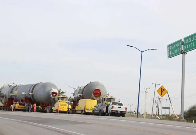 Por la carretera Tampico-Mante, en dirección a Ciudad Victoria, se desplazan dos estructuras de gran tamaño. Se trata de reactores que se utilizarán en la refinería de Tula. Partieron del puerto d