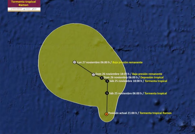 Este viernes 24 de noviembre, la depresión tropical Veinte-E se fortaleció y se convirtió en Tormenta Tropical “Ramón” en el Océano Pacífico. De acuerdo con el Servicio Meteorológico Nacion