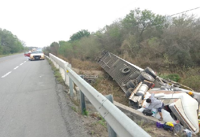 Un tráiler cargado con varias toneladas de plátano volcó la mañana de este lunes en la carretera Ciudad Victoria-Monterrey dejando varias cajas del producto esparcidas por esa zona del accidente.