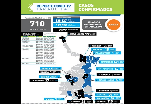 En su reporte diario sobre el estado de la pandemia, la Secretaría de Salud de Tamaulipas confirmó 710 nuevos casos durante las últimas 24 horas y 17 fallecimientos por coronavirus-19 en pacientes