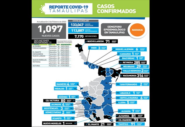 Al presentar el balance oficial de la pandemia, la titular de la SecretarÃa de Salud de Tamaulipas confirmó hoy 1,097 nuevos casos y 11 fallecimientos por covid-19. La titular de la dependencia, Glo