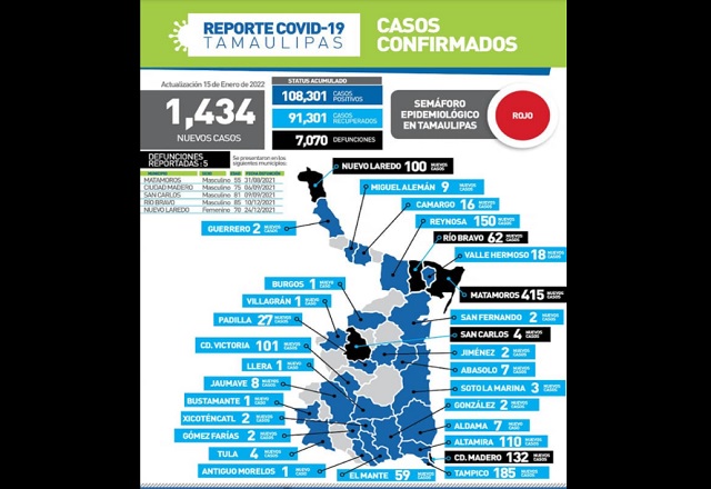 Tamaulipas cerró hoy con 1,434 positivos de covid-19, lo que significa un nuevo récord en las cifras diarias de toda la pandemia. Además se registraron cinco fallecimientos asociados a complicacion