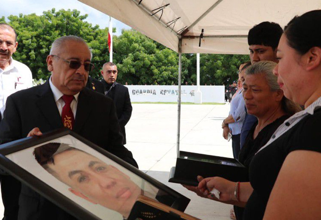 Familiares del policía recibieron de manos de la Secretaría de Seguridad Pública de Tamaulipas la bandera en reconocimiento a su labor Integrante de las Fuerzas Especiales de la Guardia Estatal, po