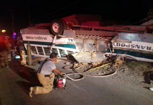 10/10/2017 - Un camión de pasajeros, de la empresa Maquilpark, volcó en la carretera Río Bravo - Reynosa, Tamaulipas, dejando siete muertos y 40 lesionados. La Secretaría de Protección Civil de T