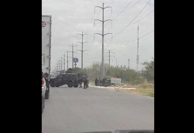 Reynosa, 10/07/17.- Un camión blindado con militares a bordo volcó esta tarde en la carretera de Reynosa a San Fernando, luego de que el conductor de la unidad perdió el control al reventarse un ne