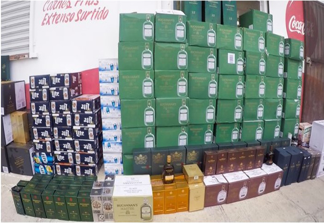 Reynosa, 06/06/17. Un operativo realizado por personal de la Secretaría de Finanzas del Gobierno de Tamaulipas, derivó en el aseguramiento de 860 botellas de whisky y 5,440 cajetillas de cigarros,