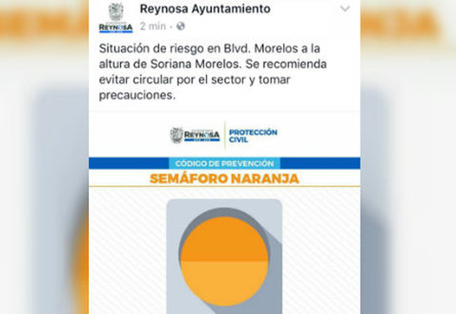 4/05/2017 -Reynosa.- El Ayuntamiento de Reynosa activó el Semáforo Naranja por una nueva situación de riesgo que se está presentando en el bulevar Morelos a la altura de un reconocido centro comer