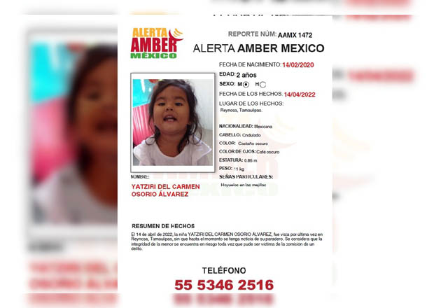 Desde hace semanas, se dio a conocer sobre la desaparición de una niña de dos años desaparecida en Reynosa, Tamaulipas, sin que hasta el momento se tenga información sobre su paradero. Fue el 14 d