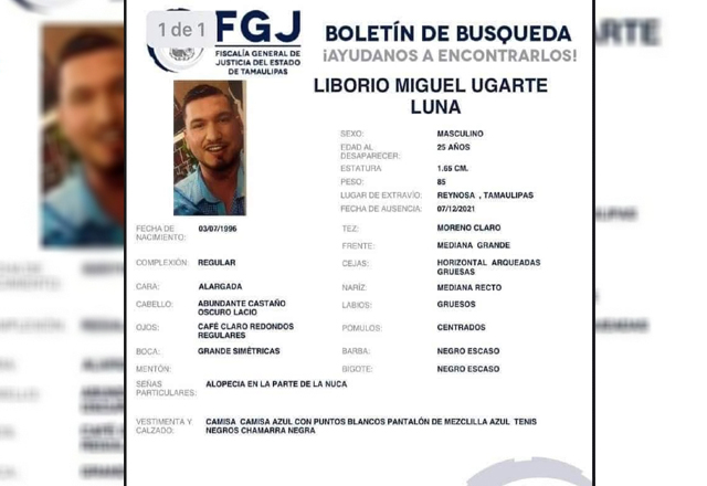 La Fiscalía General de Justicia (FGJ) de Tamaulipas emitió un boletín de búsqueda para la localización de Liborio Miguel Ugarte Luna, joven de 25 años de edad desaparecido desde el 7 de diciembr