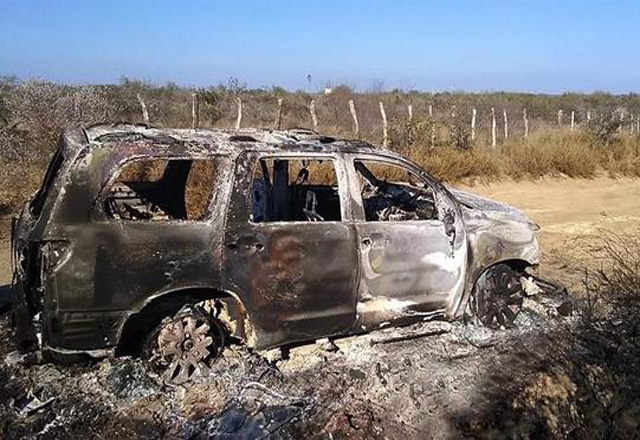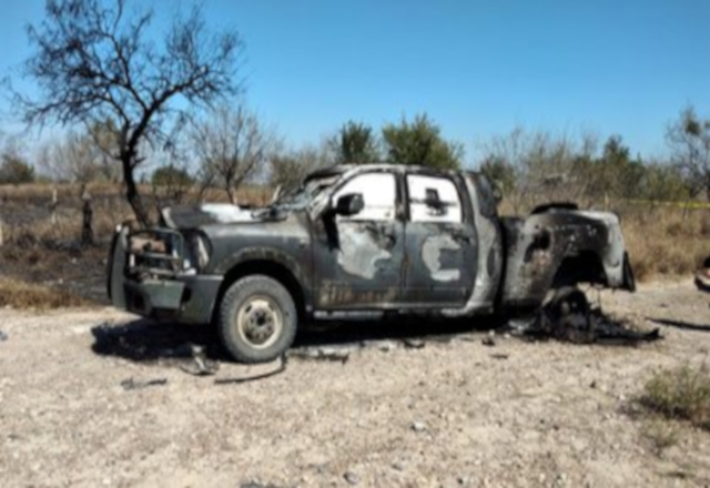 Elementos del Ejército mexicano hallaron cuatro cuerpos calcinados en una camioneta con falsos distintivos de la Secretaría de la Defensa Nacional (Sedena) en el rancho El Barretal del municipio de