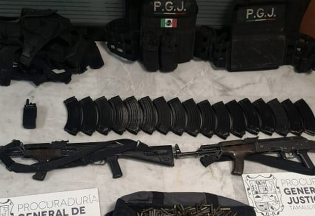 Tres hombres quedaron a disposición de la Procuraduría General de Justicia de Tamaulipas (PGJT) luego que fueron detenidos con un arsenal, y chalecos con la leyenda de "PGJE" en Reynosa, Tamaulipas.