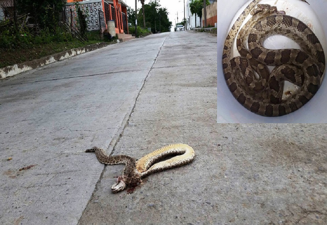 27/11/15.- Vecinos de la zona centro matan a víbora de cascabel de más de un metro de longitud, cuando trataba de cruzar la calle a la altura de la Juan B. Tijerina y Padre Mier; frente a donde se l