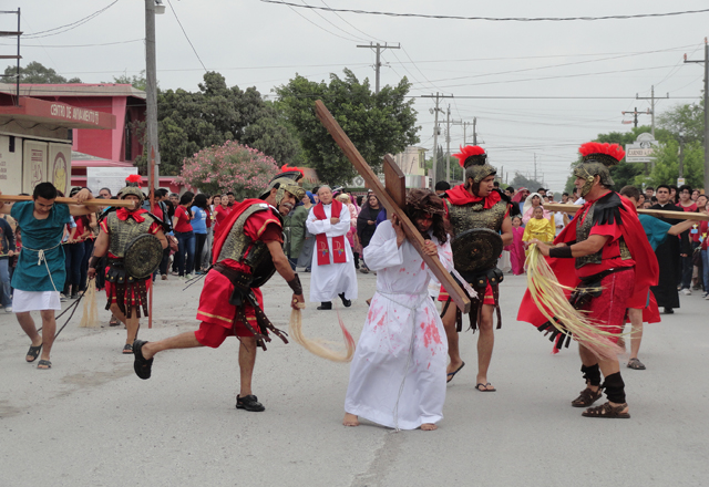 4/04/15.- Cientos de fieles católicos presenciaron el Viacrucis viviente organizado por el Movimiento Familiar Cristiano y que partió de la colonia Zapata para concluir en la Iglesia del Sagrado Cor