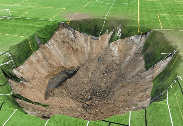 Un gigantesco socavón se tragó el centro de una cancha de futbol construida sobre una mina de piedra caliza en funcionamiento en el sur de Illinois, llevándose también un poste luz y dejando un en