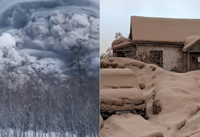 La erupción del volcán Shivéluch, uno de los más grandes de la península de Kamchatka, en el Lejano Oriente ruso, cubrió el pasado martes con cenizas varias localidades aledañas con precipitaci