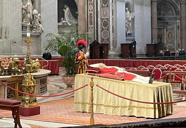 Miles de fieles madrugaron este lunes para desfilar ante el cuerpo de Benedicto XVI, en la capilla ardiente instalada en la basílica de San Pedro, en el Vaticano, para despedir al pontífice emérito