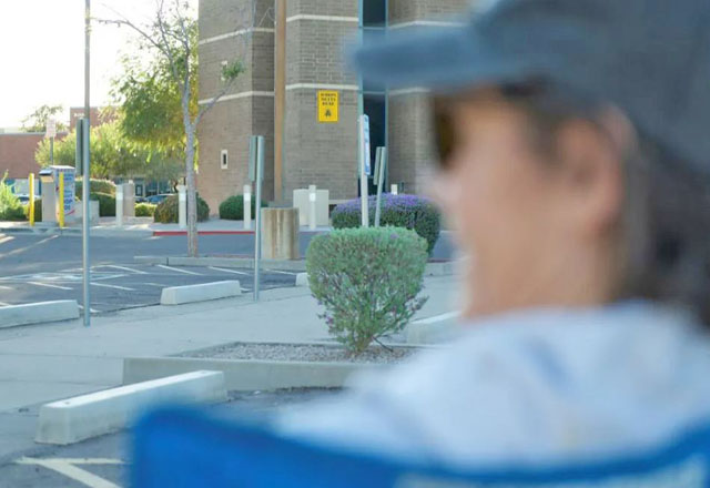 En sus sillas, Gabor Zolna, quien está armado, y dos amigas, filman una urna en un estacionamiento en los suburbios de Phoenix, Arizona, en Estados Unidos en la cual deben depositarse los votos para