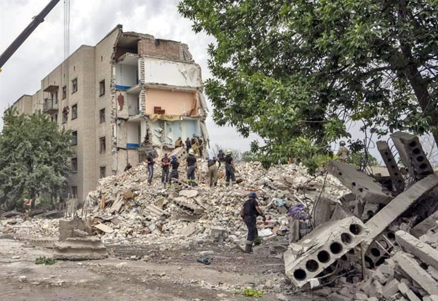 Chasiv Yar / Kiev, Ucrania.- Al menos 15 personas murieron y se teme que dos decenas estén atrapadas tras el impacto de cohetes rusos Uragan en un edificio de viviendas de cinco plantas en la región