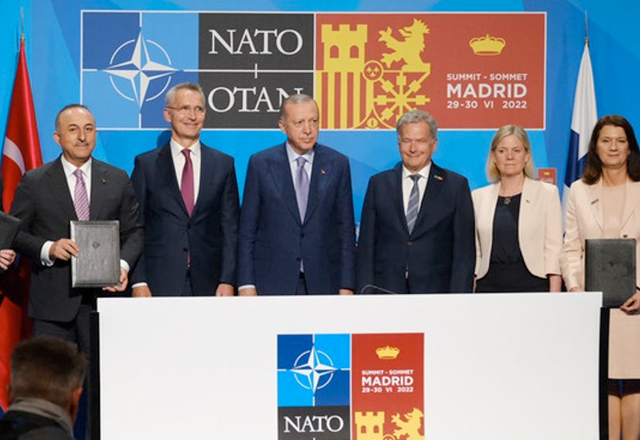 Los ministros de exteriores de Turquía, Mevlüt Çavusoglu; Finlandia, Pekka Haavisto, y Suecia, Ann Linde, firmaron este martes un acuerdo tras varias horas de reuniones para desbloquear el veto tur