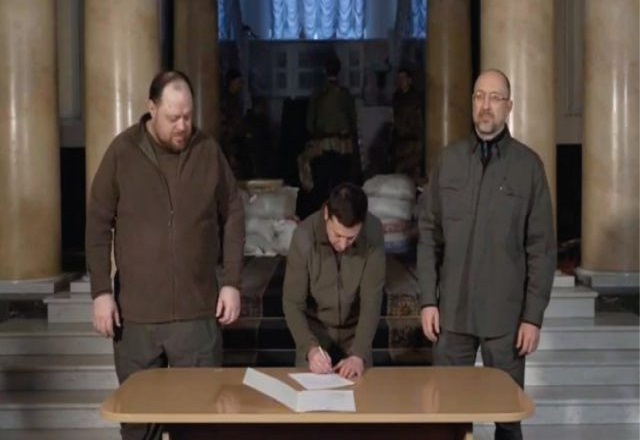 “Es un momento histórico”, dice un mensaje de la Rada Suprema (el Parlamento ucraniano) en Telegram, donde también se puede ver al mandatario ucraniano en el momento de la firma del documento. E