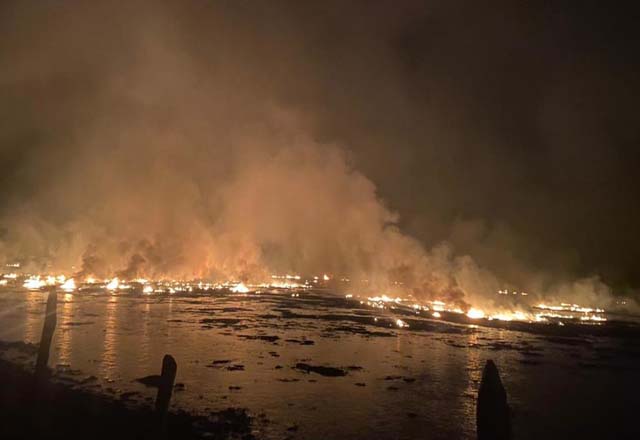 Un incendio forestal avivado por las ráfagas de los vientos de Santa Ana estalló en las colinas de la costa sur de California y ardió cerca de las casas el jueves temprano. El fuego ardió cerca de