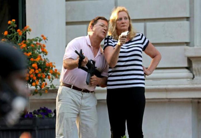 Un hombre con un fusil y una mujer con un revolver, los dos blancos apuntando desde su jardín a manifestantes, esa fue la imagen que protagonizó el abogado Mark McCloskey y su esposa Patricia en med