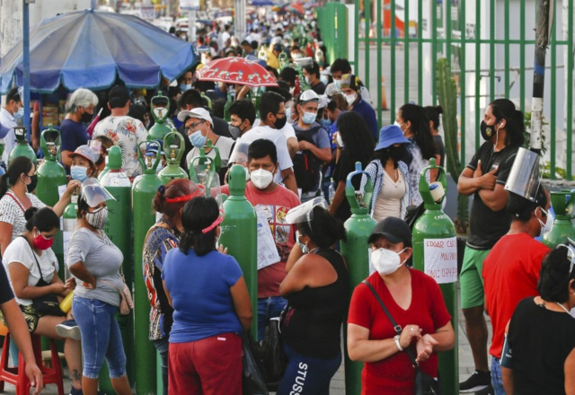 Cientos de peruanos hicieron largas filas con tanques para conseguir oxígeno para familiares con covid-19, un bien que escasea desde hace un mes ante la segunda ola de la pandemia y que ha generado e