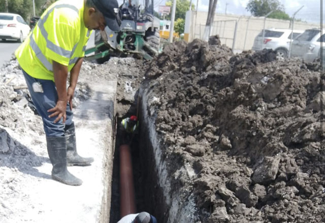 H. Matamoros.- El alcalde Beto Granados supervisó los avances de la obra de rehabilitación de la línea sanitaria en la carretera Sendero Nacional, donde se instala tubería de 12 pulgadas para mejo