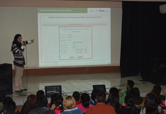 12/03/15.- Un promedio de 100 alumnos de cuarto semestre que están llevando la materia de contabilidad recibieron una plática por parte del personal del SAT, especialmente sobre el tema del régimen