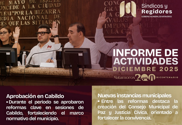H. Matamoros, Tam.- El Gobierno de Beto Granados resaltó el trabajo realizado por síndicos y regidores durante el mes de diciembre, quienes impulsaron acciones orientadas a fortalecer la vida públi