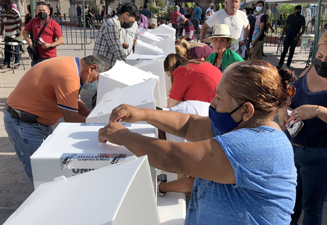 La plaza principal de Matamoros luce esta mañana completamente llena por personas de las diferentes colonias, quienes acudieron a afiliarse y a su vez a votar por los nuevos consejeros distritales de