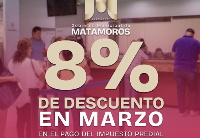 H. Matamoros.- Durante marzo, el Gobierno de Matamoros ofrece un descuento del 8% en el pago del impuesto predial para los ciudadanos que se encuentren al corriente en sus contribuciones. El Gobierno