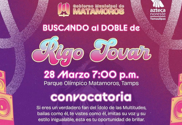 H. Matamoros.- El gobierno municipal de Matamoros, encabezado por el alcalde Beto Granados, invita a los ciudadanos a participar en el concurso “El doble de Rigo Tovar”, un evento que rendirá hom