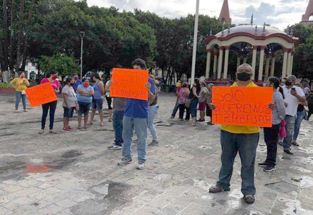 Matamoros, Tam..- Tianguistas se manifiestan en la plaza Miguel Hidalgo, pidiendo que las autoridades estatales les permitan trabajar. Con cartulinas en mano con textos, "queremos trabajar", es la man