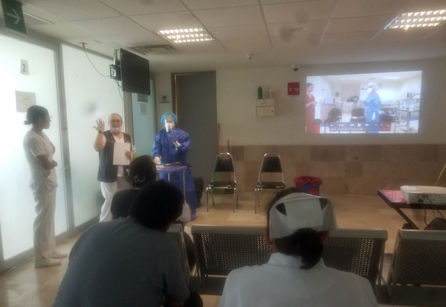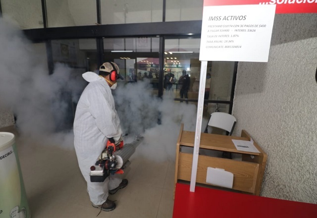 Los trabajos de sanitización en espacios públicos continuaron este jueves en clínicas y hospitales del IMSS e ISSSTE, así como también en el general “Dr. Alfredo Pumarejo”, acciones que impul
