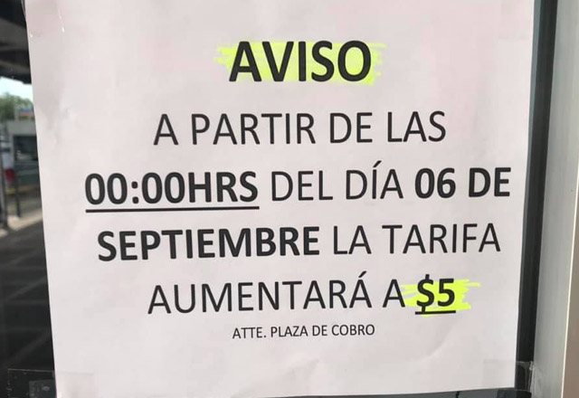 De acuerdo con un aviso colocado en puerto internacional Puerta México, mejor conocido como Puente Nuevo, a partir de hoy se aumentó un peso a la tarifa de peatones, que hasta ayer era de cuatro pes