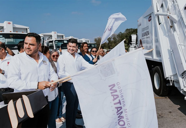 Matamoros, Tamaulipas. El alcalde Alberto Granados encabezó esta tarde la entrega de 20 nuevos camiones compactadores a la Dirección de Limpieza Pública Municipal, fortaleciendo la capacidad de rec