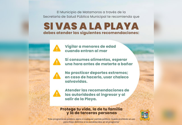 La Secretaría de Salud Municipal y la Dirección de Protección Civil del Municipio de Matamoros, exhortan a los visitantes a la Playa Bagdad a cumplir con las recomendaciones de las autoridades, est