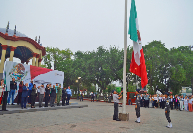 Autoridades municipales, educativas, civiles y militares participaron esta mañana en la ceremonia de honores a la Bandera, organizada por la Secretaría de Educación, Cultura y Deporte en coordinaci