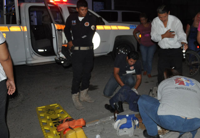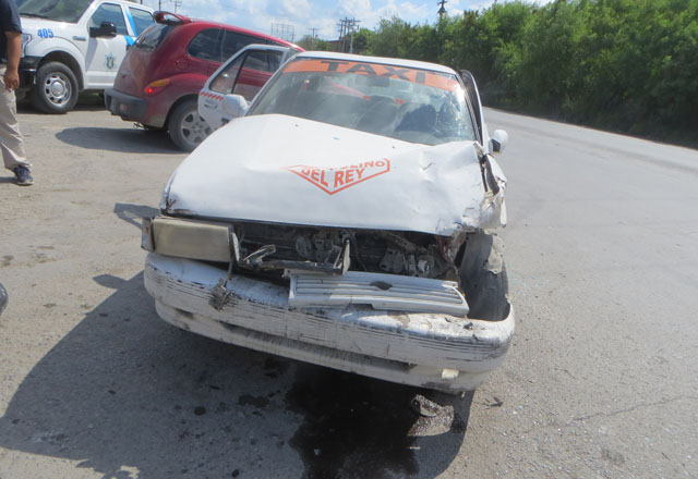 1/10/2016 - Cuatro personas lesionadas, tres pasajeros y un taxista, fue el saldo de un fuerte choque en la carretera del Sendero Nacional y la avenida Puerto Escondido, entre un carro de alquiler y
