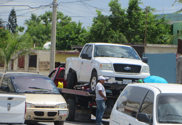 30/08/2016 - Descuidado conductor de una camioneta Dodge Durango chocó contra una camioneta pick up, y la proyectó contra barandal de protección, en el libramiento Emilio Portes Gil y calle Soto L