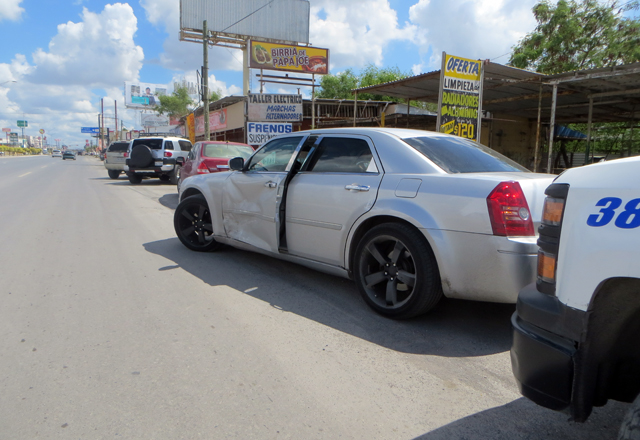 29/08/2016 - Un texano dio una vuelta en "U" sobre las avenidas Pedro Cárdenas y del Trabajo con su automóvil marca Chrysler 300, provocando ser chocado por otro automovilista. Andrés Pérez, de 1