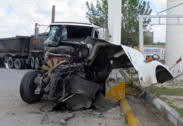 23/08/2016 - Una mala maniobra del chofer de un tráiler con doble remolque de volteo, provocó que chocara contra un muro de concreto, de una gasolinera ubicada por la carretera a Ciudad Victoria, a