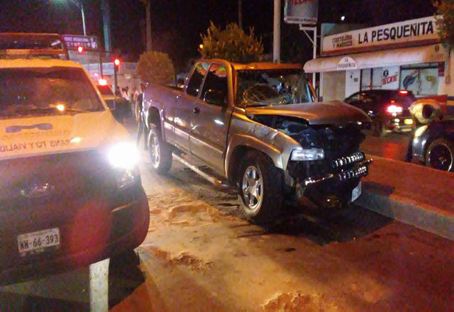 9/08/16.-Por manejar en completo estado de ebriedad fue que un residente de la colonia Campestre del Río que dice trabajar en los Estados Unidos, choca contra la base de un semáforo y deja su camion