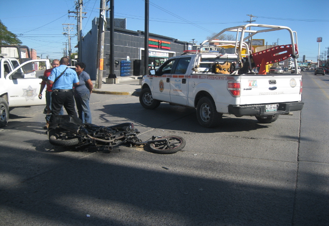 18/01/16.-El conductor de una motocicleta resultó herido y con golpes en el cuerpo al estrellar su caballo de acero contra una camioneta que se le atravesó en las calles Diagonal Cuauhtémoc y Ocamp